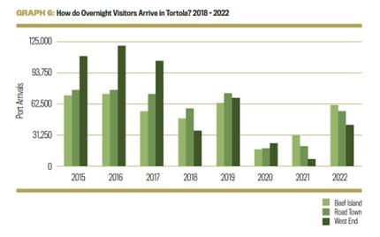 By 2022 the number of overnight tourists arriving by sea had dropped to 63%. The destruction of the West End ferry terminal in Hurricane Irma, and the inability of the Government to rebuild it except with a temporary structure, has had a significant impact on the arrival of tourists by sea, with the terminal only opening back up to international ferry services in November 2022, albeit with a limited service.