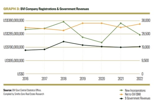 This was compounded by a series of damaging data leaks (the Panama Papers 2016; Paradise Papers 2017 and Pandora Papers 2021) resulting in a move to improve transparency in financial centres. Threats to Government revenues, generated by financial services were identified in the IMF’s 2010 report “British Virgin Islands: Financial Sector Assessment Program Update— Financial System Stability Assessment.” One of the key findings of this report stated : “The heavy reliance on the financial services industry for revenue in the territory creates significant pressure on the FSC to continuously update and adopt regulatory practices that are credible internationally, as well as practical in the jurisdiction.” The report also noted that the BVI’s fiscal health was deteriorating and the economy had been in a deficit position for several years. The report stated that “generating revenue growth is the challenge of the future—it is clear that financial sector growth has slowed as the corporate registration business may have matured. Further growth in this sector must come from value-added services.” The report also noted that “the chief threat to the thriving offshore business is the loss of reputation internationally and the authorities are well attuned to this risk.” After the report was released, the financial services sector experienced a sustained decline in the total number of companies incorporated in the BVI falling by approximately 22% between the end of 2011 and 2023. However, a fee increase in 2018 helped cushion the fall in Government revenues from financial services which increased to $232M in 2018, a 32% increase compared to 2017 and have remained above, or close to, $200M in the years since.
