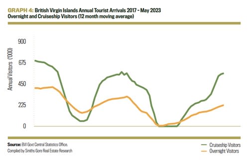 While the 2022/23 high season tourism traffic provided grounds for optimism that the industry is recovering, data indicates that overnight and day tripper tourism fell by 58% between 2016 and 2022 from 425,384 arrivals to 179,718 indicating that this sector has a long way to go before the then record arrivals of 2016 are again achieved. Access remains a critical driver for the recovery of tourism. While significant political weight has been placed upon improving air travel to the BVI, arrivals by sea have traditionally accounted for around 80% of overnight arrivals until Hurricane Irma, as shown in Graph 5.