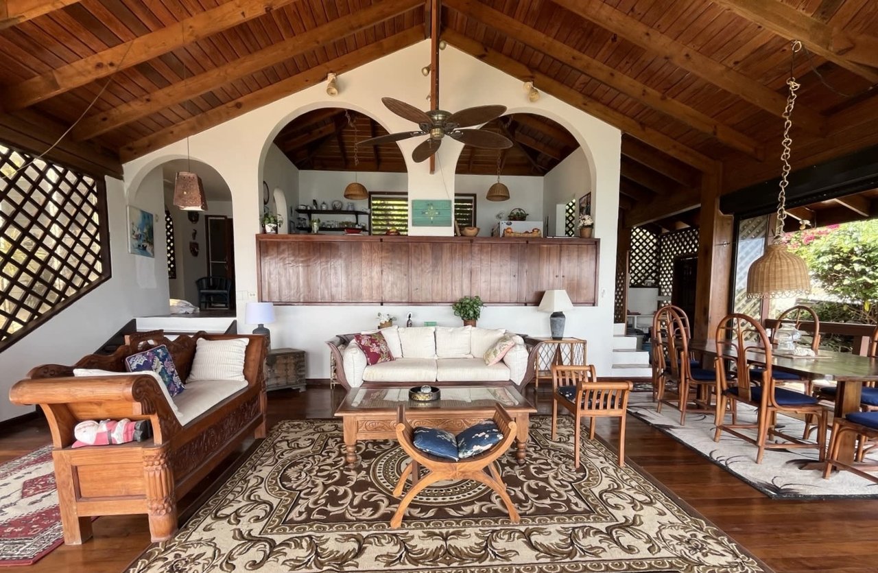 The villa features a dramatic split-level great room with double-height ceilings, South American hardwood floors, and large openings on three sides capturing views of the channel. Electronically operated wooden shutters provide security and weather protection. A fully fitted galley kitchen overlooks the great room through elegant arched openings.