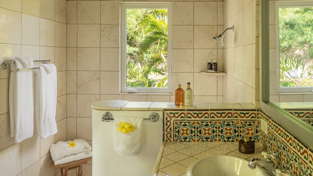 Wander through a walkway of pretty palms to find The Palm nestled in the villa’s treescape. Relax in the romantic privacy of this delightful couple’s retreat. Enjoy a cocktail on comfortable loungers while glimpsing ocean blues through flamboyant and tamarind treetops.